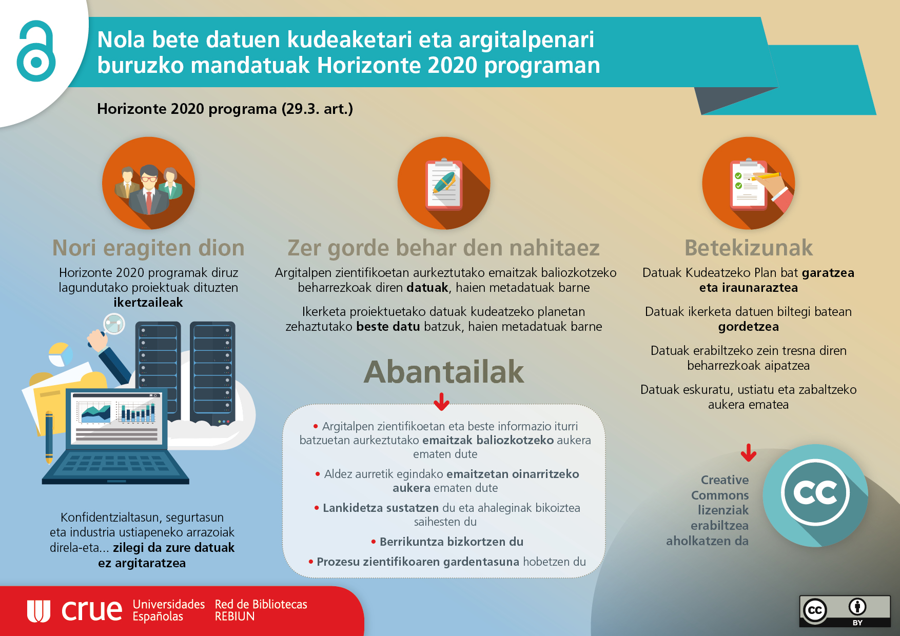 Title:Cómo cumplir con los mandatos sobre gestión y publicación de datos en Horizonte 2020; Com complir amb els mandats sobre gestió i publicació de dades; Nola bete datuen kudeaketari eta argitalpenari buruzko mandatuak Horizonte 2020 programan; Como cumprir cos mandatos sobre xestión e publicación de datos en Horizonte 2020